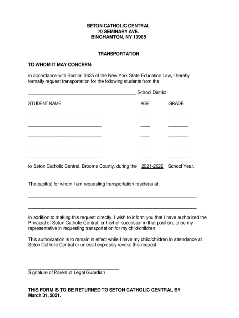 SETON CATHOLIC CENTRAL 70 SEMINARY AVE. BINGHAMTON, NY 13905TRANSPORTATION TO WHOM IT MAY CONCERN: In accordance with Section 3635 of the New York State Education Law, I hereby formally request transportation