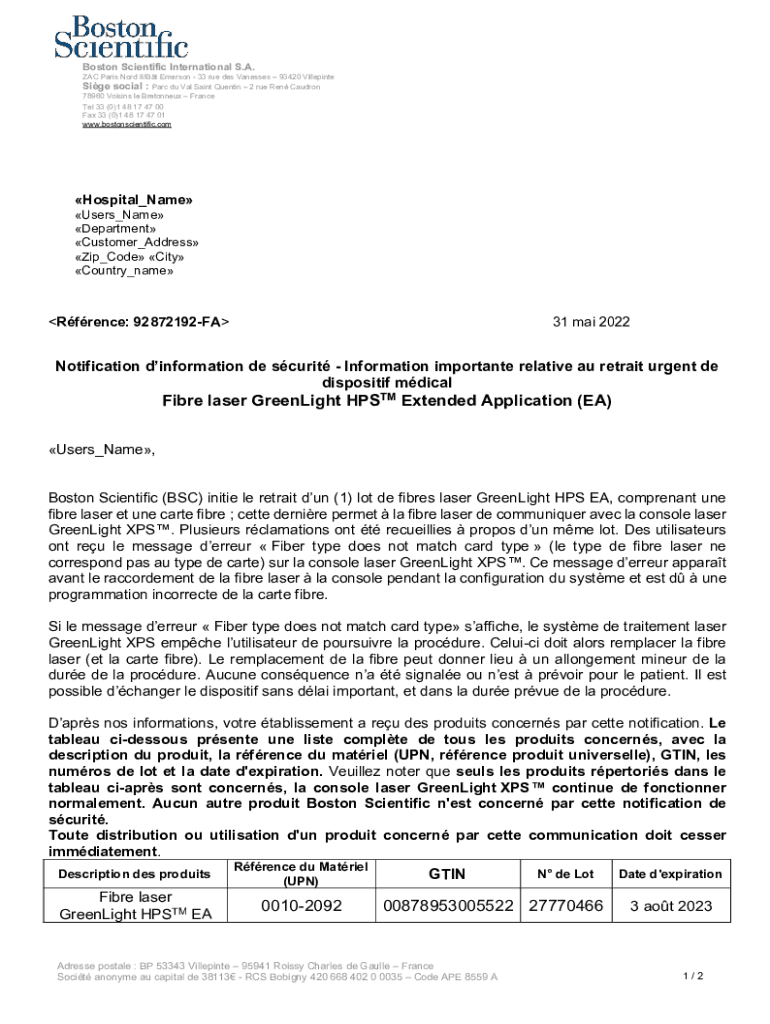Boston Scientific International S.A.ZAC Paris Word II/BT Emerson 33 rue DES Vanessa 93420 Villeins Side social : PARC du Val Saint Quentin 2 rue Men Cauldron 78960 Visits LE Cretonne France Tel 33