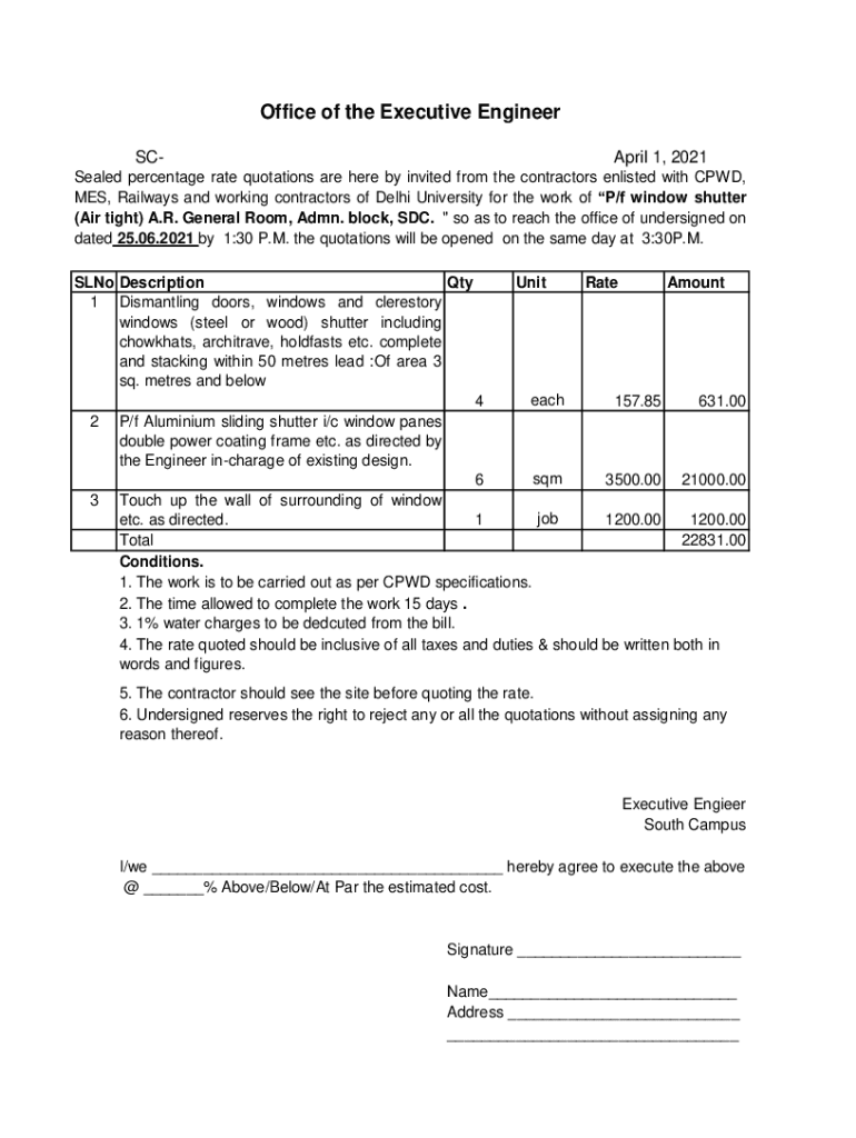 Office of the Executive Engineer SC April 1, 2021Sealed percentage rate quotations are here by invited from the contractors enlisted with CPD, MES, Railways and working contractors of Delhi University