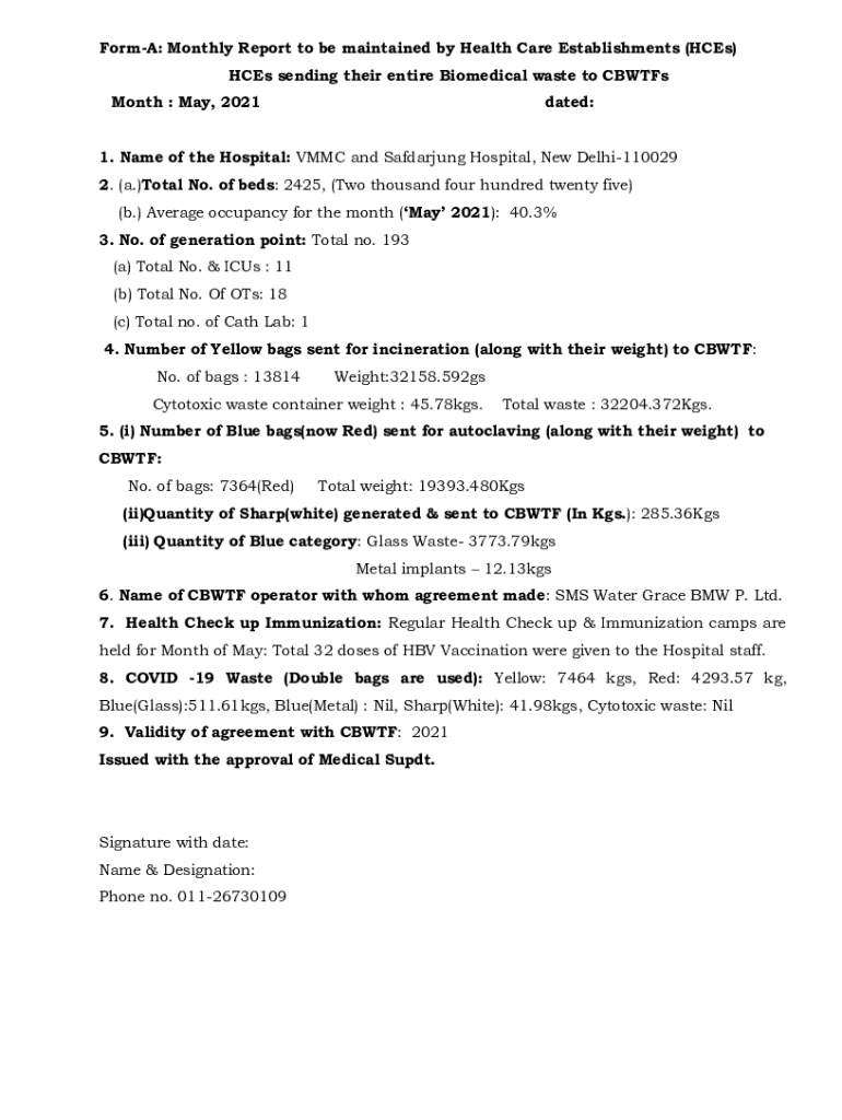 Form: Monthly Report to be maintained by Health Care Establishments (Aces) Aces sending their entire Biomedical waste to Costs Month : May, 2021dated:1. Name of the Hospital: MMC and Safariing Hospital,
