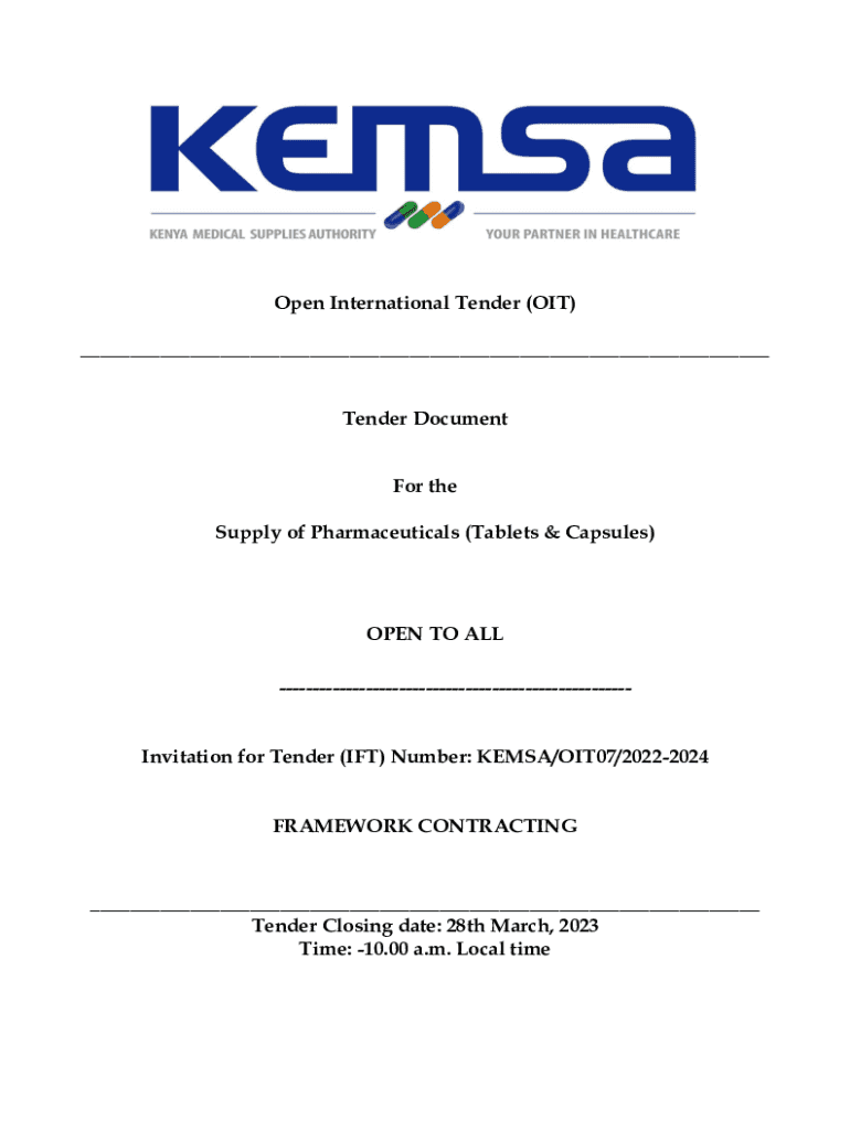 Open International Tender (OIT) ___ Tender Document For the Supply of Pharmaceuticals (Tablets & Capsules)OPEN TO ALL Invitation for Tender (IT) Number: KE MSA/OIT07/20222024 FRAMEWORK CONTRACTING___