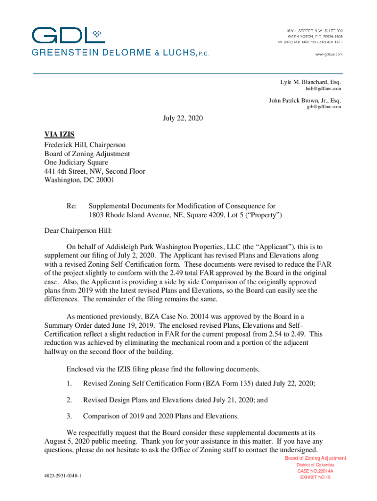Lyle M. Blanchard, Esq. lmb@gdllaw.comJohn Patrick Brown, Jr., Esq. jpb@gdllaw.comJuly 22, 2020 VIA IRIS Frederick Hill, Chairperson Board of Zoning Adjustment One Judiciary Square 441 4th Street,
