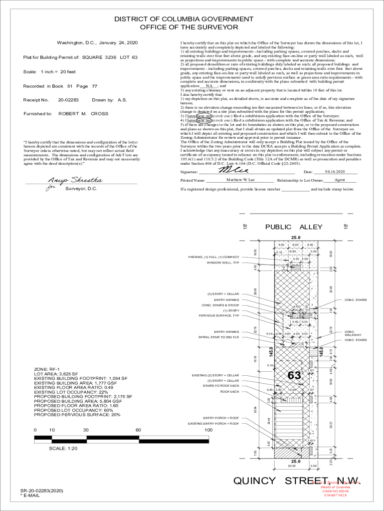 DISTRICT OF COLUMBIA GOVERNMENT OFFICE OF THE SURVEYOR Washington, D.C., January 24, 2020, Plat for Building Permit of: SQUARE 3236 LOT 63 Scale: 1 inch 20 feet Recorded in Book 51-Page 77 Receipt