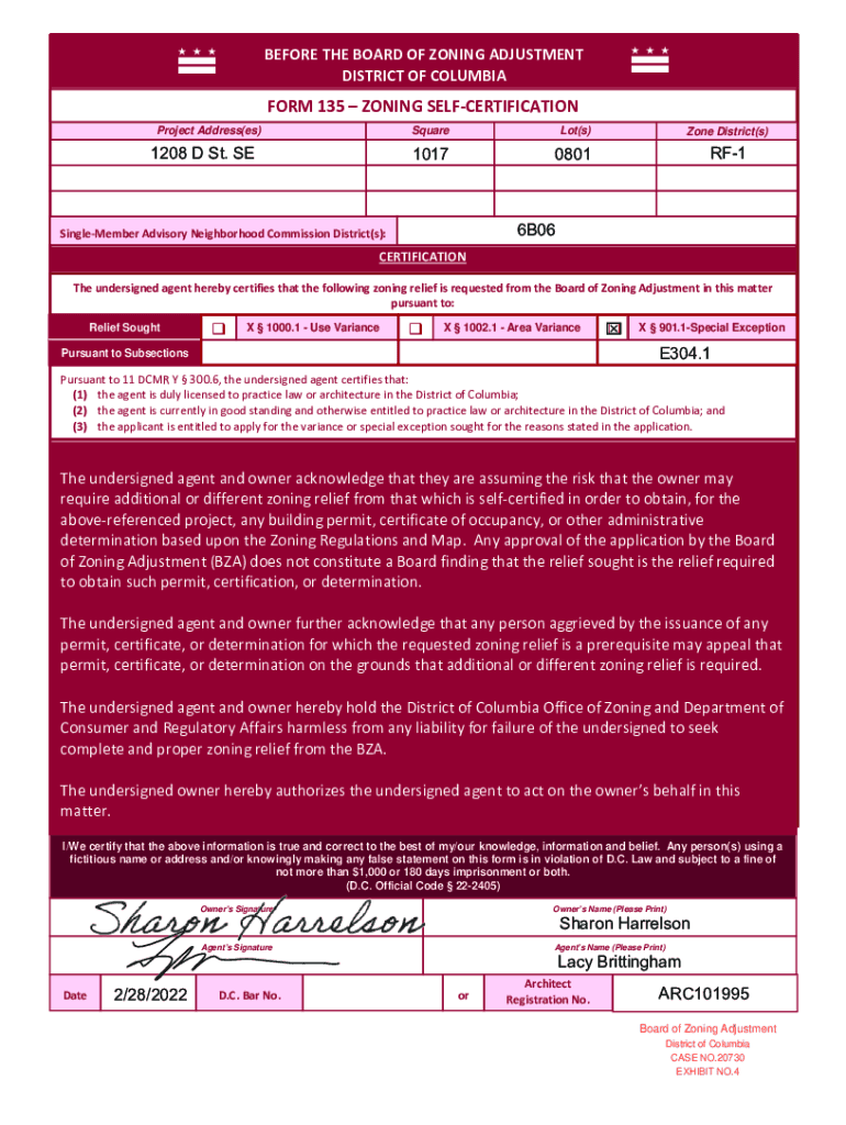 BEFORE THE BOARD OF ZONING ADJUSTMENT DISTRICT OF COLUMBIAFORM 135 ZONING RECERTIFICATION Project Address(BS)1208 D St. SESquareLot(s)Zone District(s)10170801RF16B06SingleMember Advisory Neighborhood