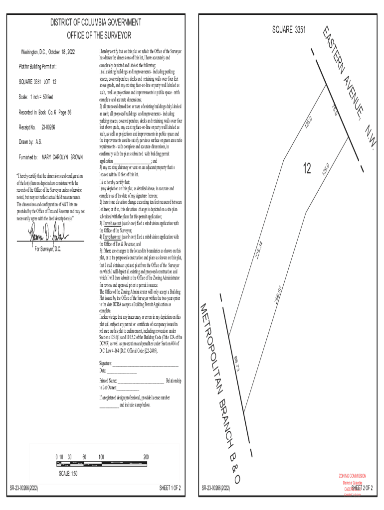 DISTRICT OF COLUMBIA GOVERNMENT OFFICE OF THE Surveyor a registered design professional, provide license number ___ and include stamp below.0 103060100200SCALE: 1:50 SR2300266(2022)SHEET 1 OF 273