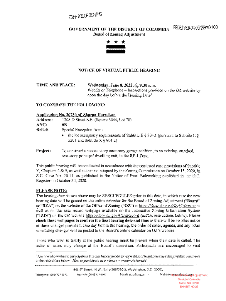 Office lg\'leg GOVERNMENT OF THE DISTRICT OF COLUMBIA Board of Zoning AdjustmentCEIVED040522Pl10400*** NOTICE OF VIRTUAL PUBLIC HEARING TIME AND PLACE:Wednesday, June 8, 2022,@ 9:30 a.m. WebEx or