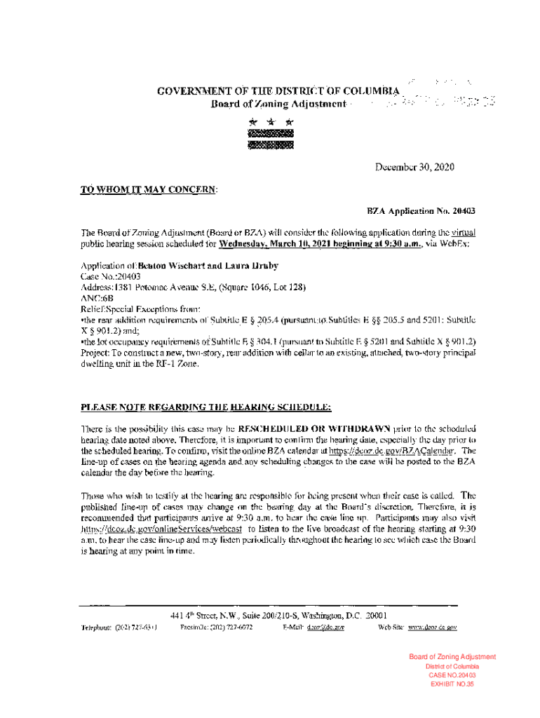 GOVERNMENT OF THE DISTRICT OF. COLUMBIA B9rd of Ming Adjust111ent.n.LFC:t*** December 30, 2020, TO WHOM IT MAY CONCERN: BZA Application No. 20403The Board of Zoning Adjustment (Board or BZA) will