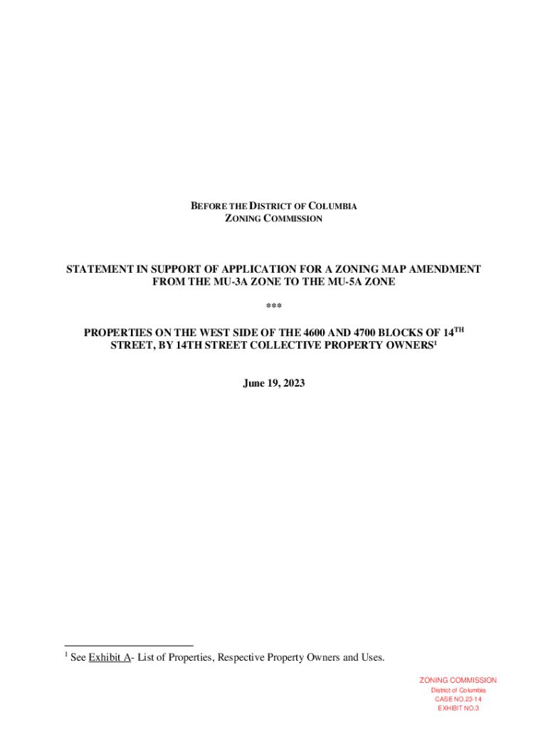 BEFORE THE DISTRICT OF COLUMBIA ZONING COMMISSIONSTATEMENT IN SUPPORT OF APPLICATION FOR A ZONING MAP AMENDMENT FROM THE MU3A ZONE TO THE MU5A ZONE *** PROPERTIES ON THE WEST SIDE OF THE 4600 AND