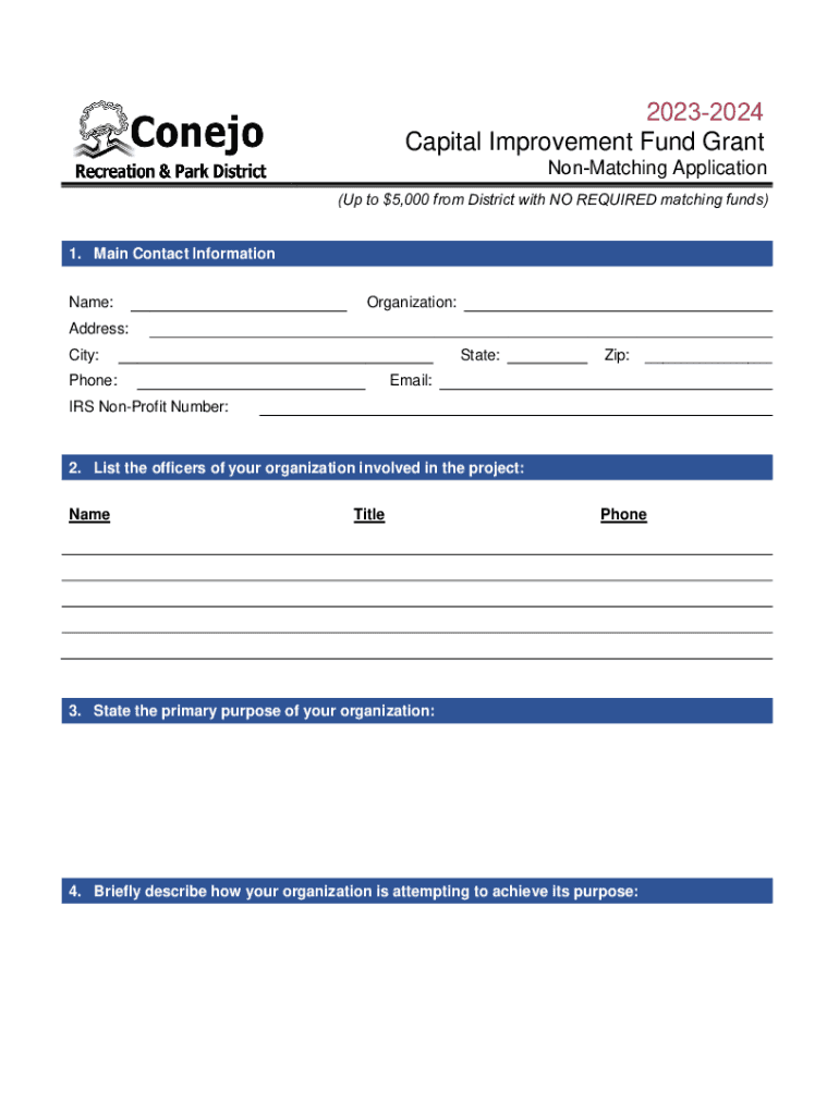 20232024 Capital Improvement Fund GrantNonMatching Application(Up to $5,000 from District with NO REQUIRED matching funds) 1. Main Contact Information Name:Organization:Address: City:State:Phone:Zip:___Email:IRS