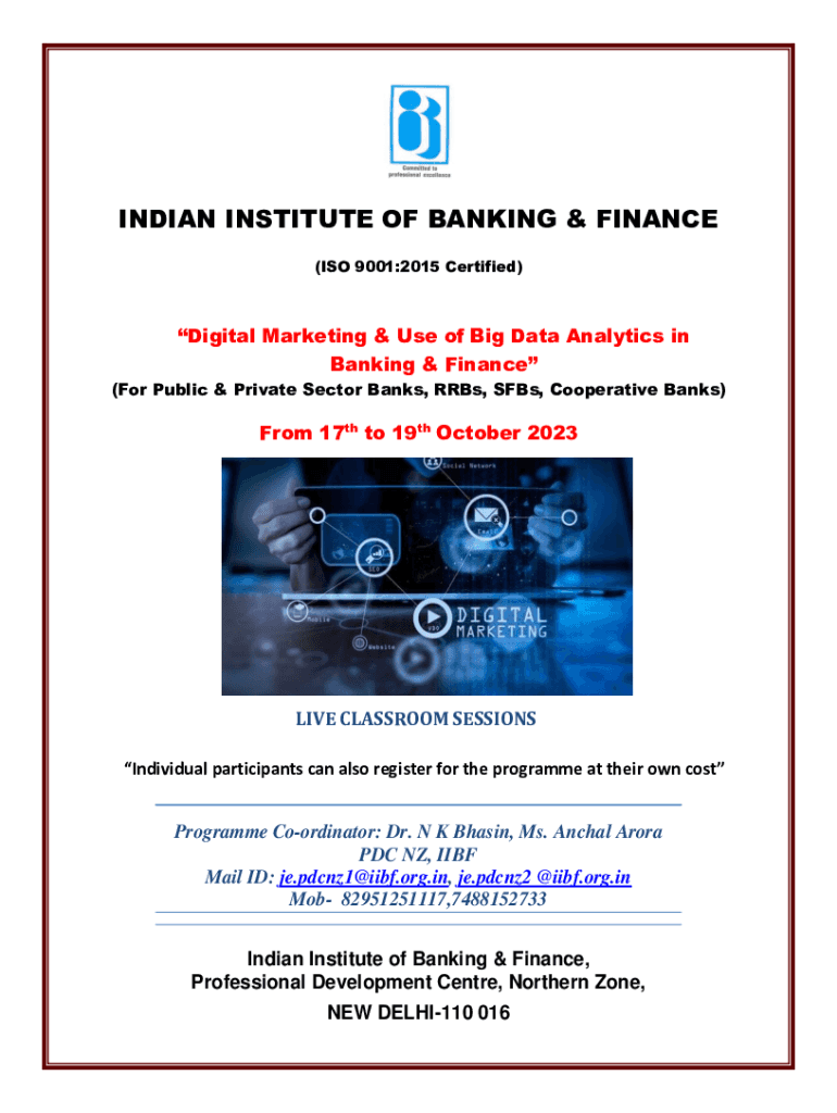 INDIAN INSTITUTE OF BANKING & FINANCE (ISO 9001:2015 Certified)Digital Marketing & Use of Big Data Analytics in Banking & Finance (For Public & Private Sector Banks, Ribs, SBS, Cooperative Banks)From