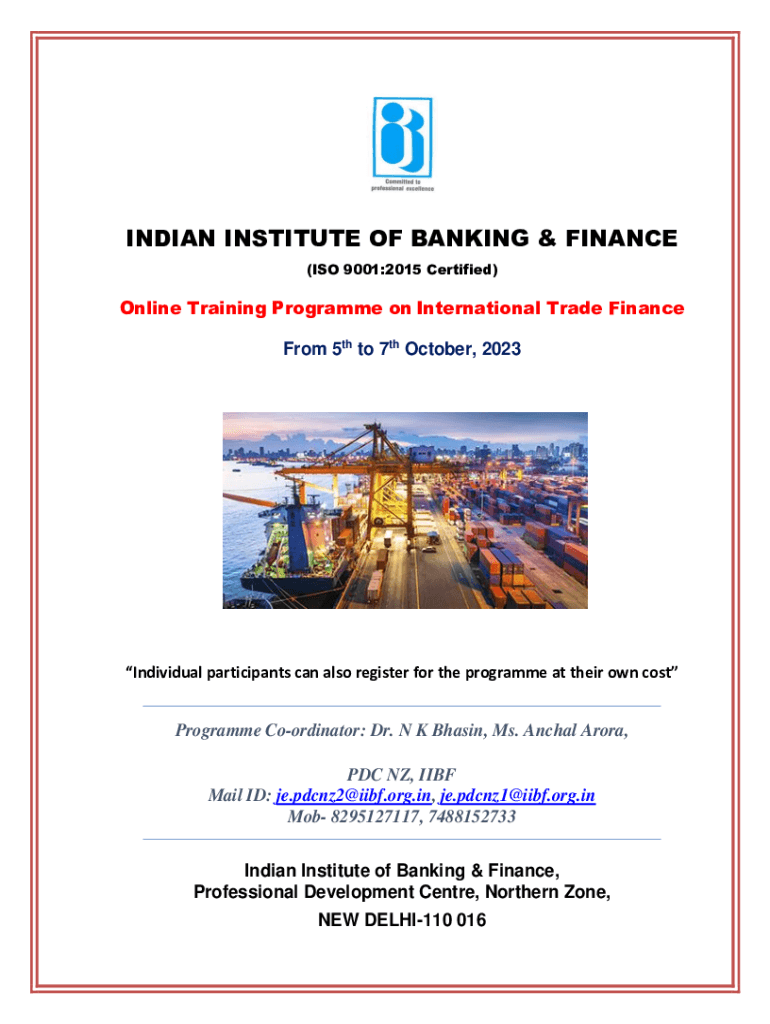 INDIAN INSTITUTE OF BANKING & FINANCE (ISO 9001:2015 Certified)Online Training Program on International Trade Finance From 5th to 7th October, 2023Individual participants can also register for the