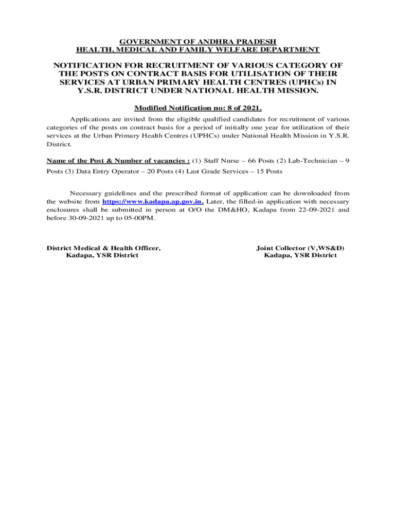 GOVERNMENT OF ANDHRA PRADESH HEALTH, MEDICAL AND FAMILY WELFARE DEPARTMENTNOTIFICATION FOR RECRUITMENT OF VARIOUS CATEGORY OF THE POSTS ON CONTRACT BASIS FOR Utilization OF THEIR SERVICES AT URBAN