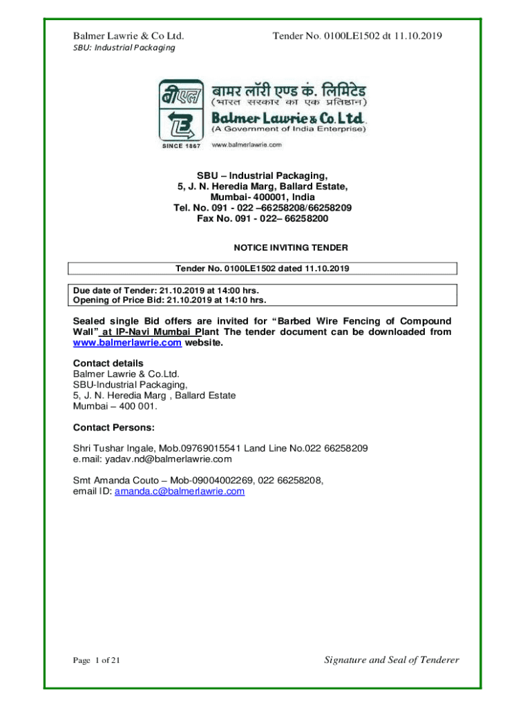Palmer Laurie & Co Ltd. Tender No. 0100LE1502 DT 11.10.2019SBU: Industrial Packaging, 5, J. N. Hardin Mary, Ballard Estate, Mumbai 400001, India Tel. No. 091 022 66258208/66258209 Fax No. 091 022