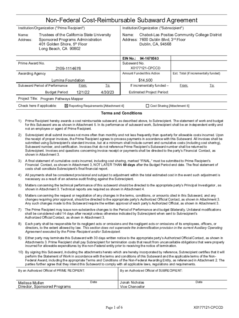 Get the free Non-Federal Cost-Reimbursable Subaward Agreement