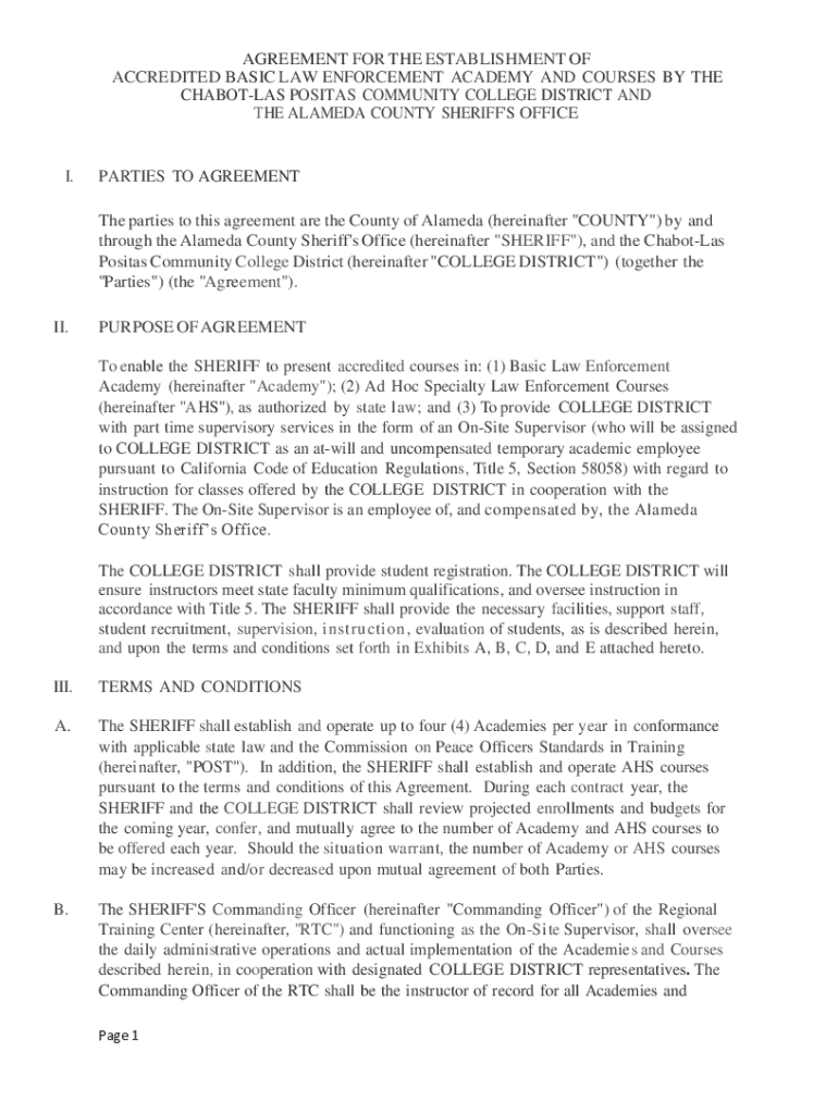 AGREEMENT FOR THE ESTABLISHMENT OF ACCREDITED BASIC LAW ENFORCEMENT ACADEMY AND COURSES BY THE CHABLIS POSITS COMMUNITY COLLEGE DISTRICT AND THE ALAMEDA COUNTY SHERIFF\'S OFFICE.PARTIES TO AGREEMENT