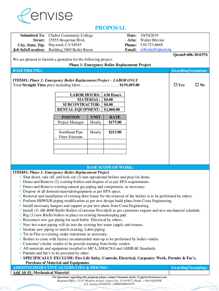 PROPOSAL Submitted To: Street: City, State, Zip: Job Info/Location:Cabot Community College 25555 Hesperia Blvd, Hayward, CA 94545 Building 2800 Boiler Roommate: Attn: Phone: Email:10/30/2019 Walter