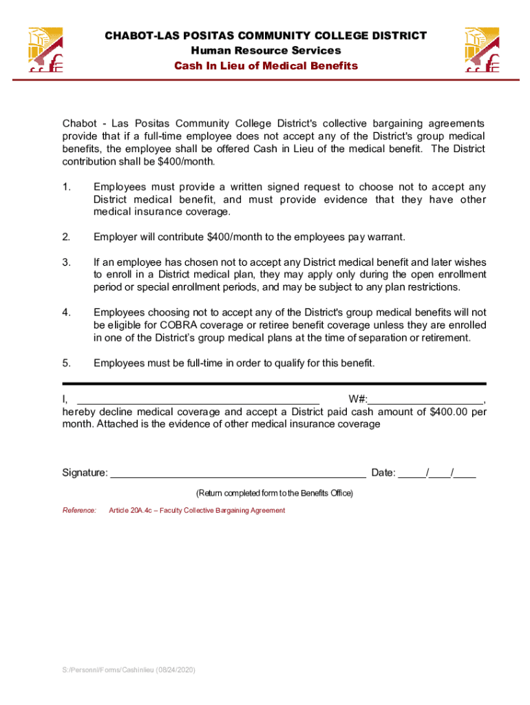 CHABLIS POSITS COMMUNITY COLLEGE DISTRICT Human Resource Services Cash In Lieu of Medical BenefitsChabot Las Posits Community College District\'s collective bargaining agreements provide that if a