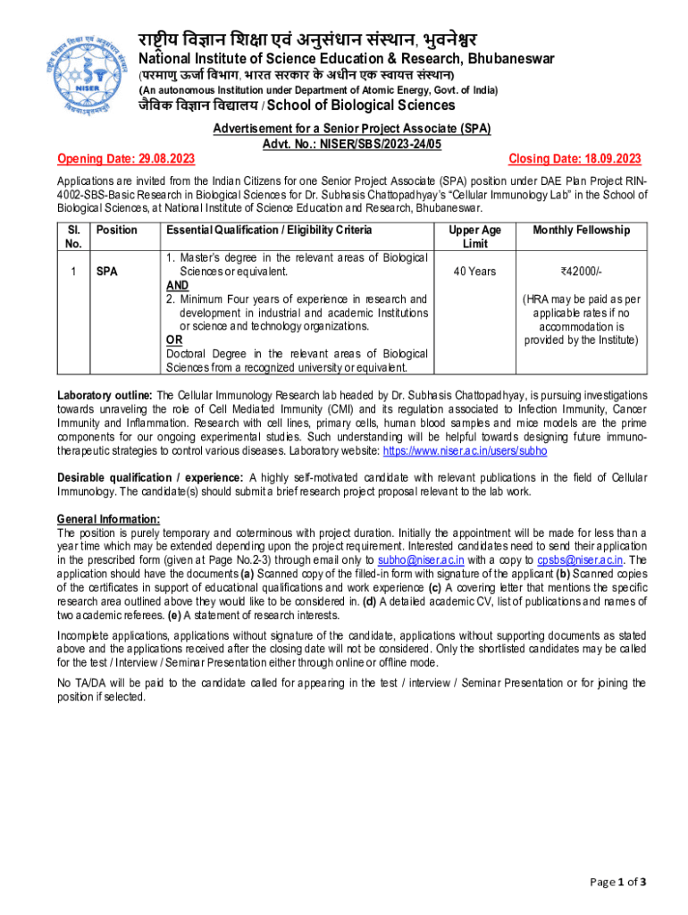 , National Institute of Science Education & Research, Bhubaneswar (,) (An autonomous Institution under Department of Atomic Energy, Govt. of India)