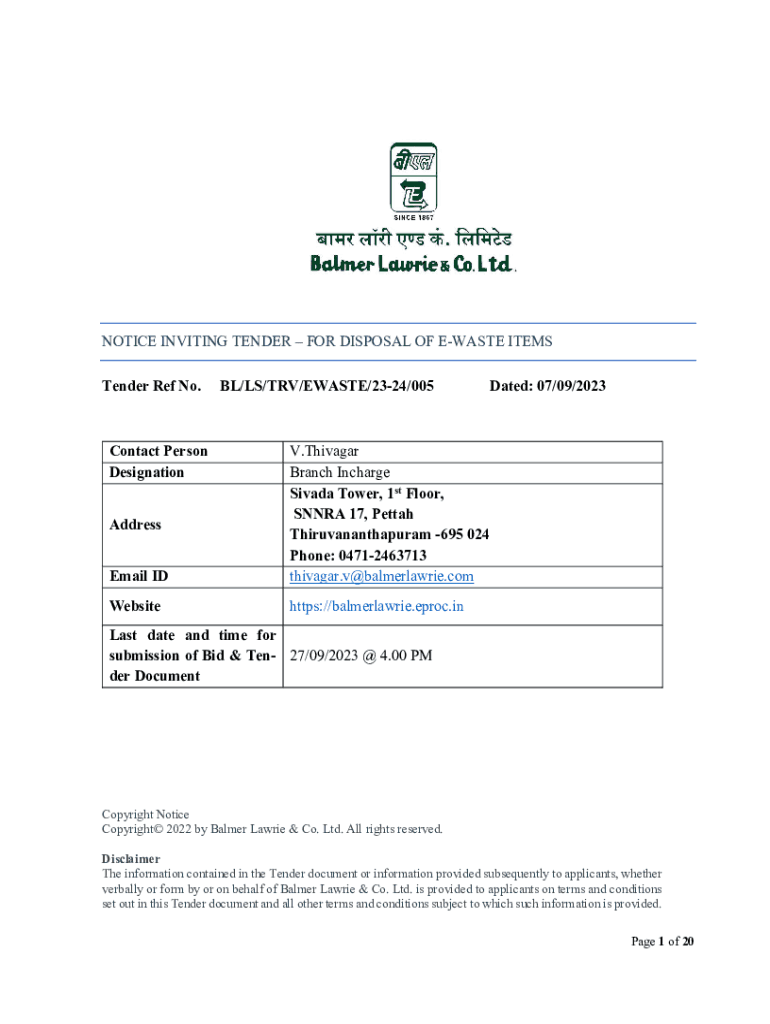 NOTICE INVITING TENDER FOR DISPOSAL OF WASTE ITEMS Tender Ref No. Contact Person Designation/LS/TRY/WASTE/2324/005Email ID. Hagar Branch In charge Nevada Tower, 1st Floor, SN NRA 17, Perth Thiruvananthapuram