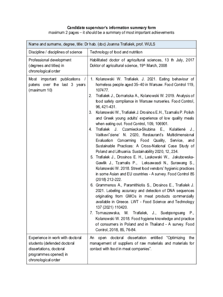 Candidate supervisors information summary form maximum 2 pages it should be a summary of most important achievements Name and surname, degree, title: Dr had. (doc) Joanna Trailer, prof. WUSS Discipline