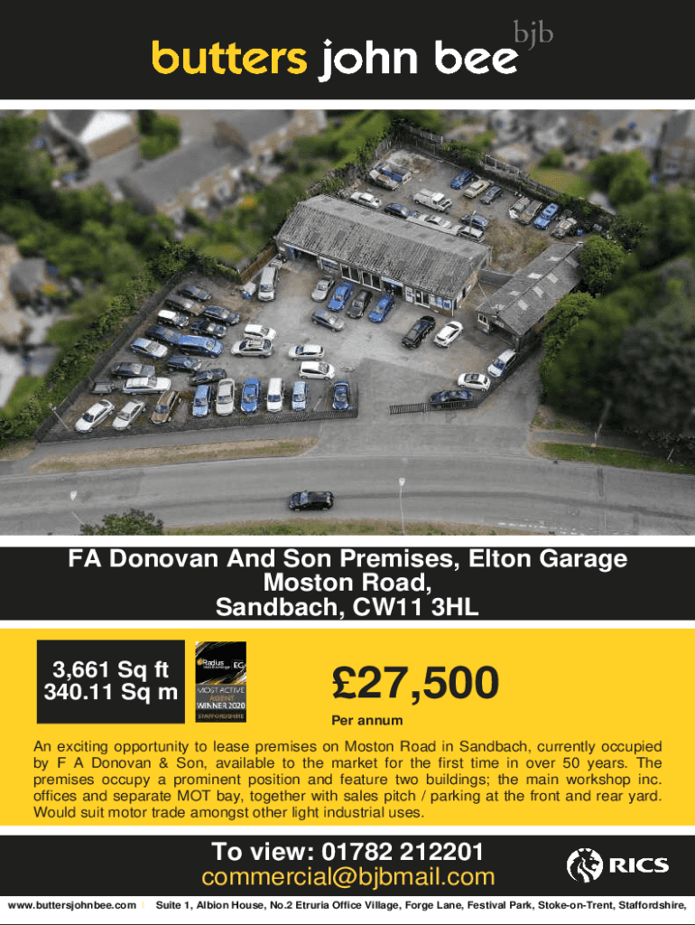 FA Donovan And Son Premises, Elton Garage Boston Road, Sandwich, CW11 3HL 3,661 Sq ft 340.11 Sq m27,500 Per annual exciting opportunity to lease premises on Boston Road in Sandwich, currently occupied