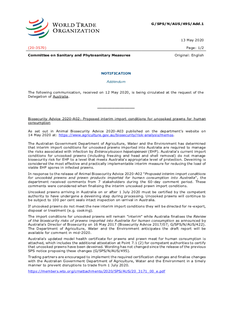 G/SPS/N/AUS/495/Add.113 May 2020 (203570)Page: 1/2Committee on Sanitary and Phytosanitary MeasuresOriginal: EnglishNOTIFICATION Addendum The following communication, received on 12 May 2020, is being