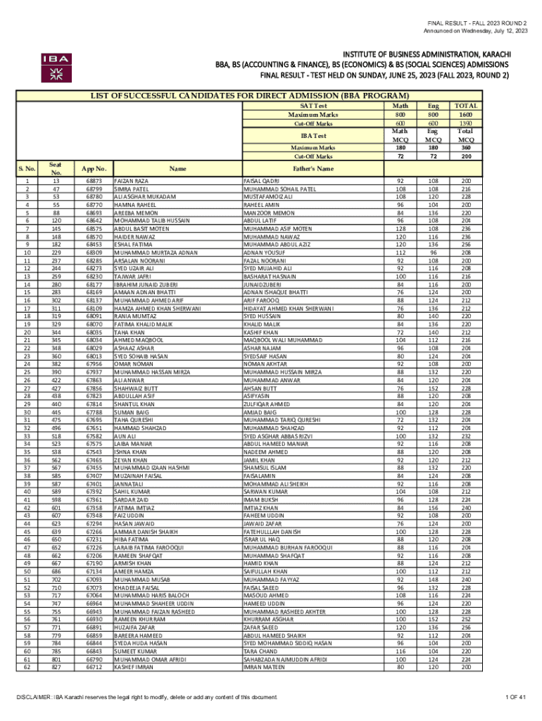 FINAL RESULT FALL 2023 ROUND 2 Announced on Wednesday, July 12, 2023INSTITUTEOFBUSINESSADMINISTRATION,KARACHI BBA, BS(ACCOUNTING&FINANCE), BS(ECONOMICS)LBS(SOCIALSCIENCES)ADMISSIONS FINALRESULTTESTHELDONSUNDAY,JUNE25,2023(FALL2023,ROUND2)