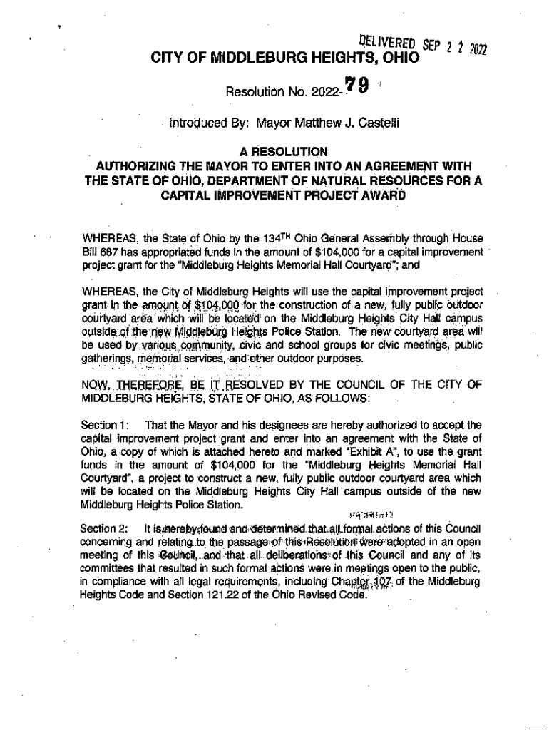Delivered SEP 2 ? 2022CITY OF MIDDLEBURY HEIGHTS, OHIO\” 79Resolution No. 2022Introduced By: Mayor Matthew J. Costello A RESOLUTION AUTHORIZING THE MAYOR TO ENTER INTO AN AGREEMENT WITHE STATE OF