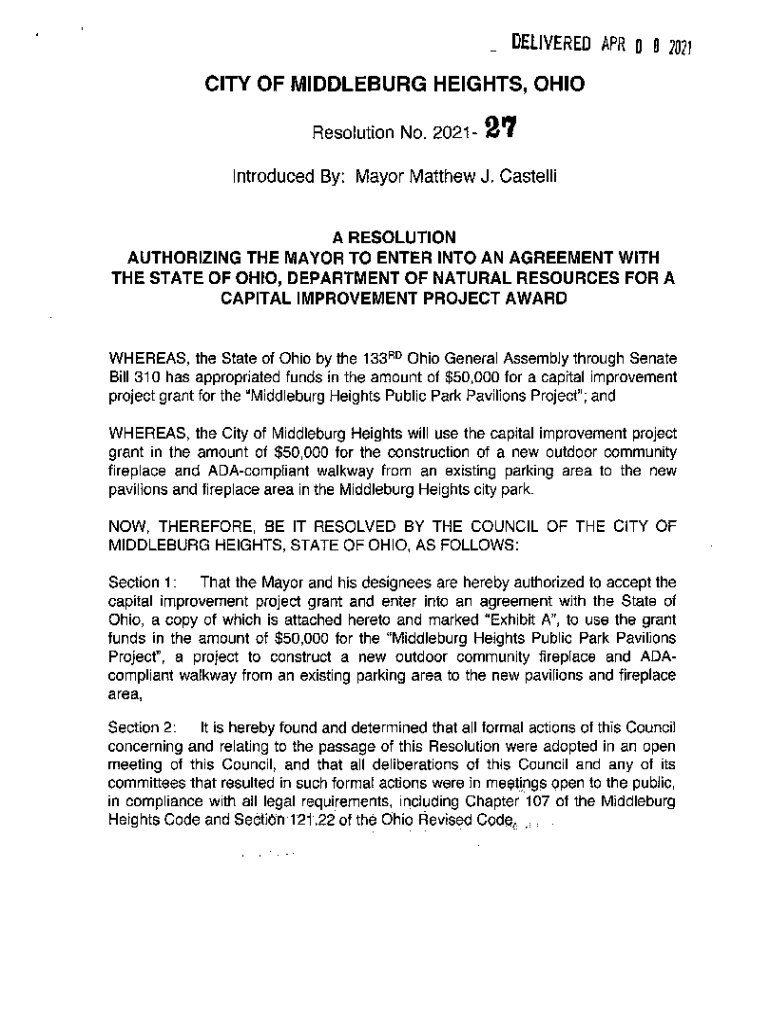 . Delivered APR D 8 ?02l CITY OF MIDDLEBURY HEIGHTS, Irresolution No. 2021 27 Introduced By: Mayor Matthew J. Camellia RESOLUTION AUTHORIZING THE MAYOR TO ENTER INTO AN AGREEMENT WITHE STATE OF OHIO,