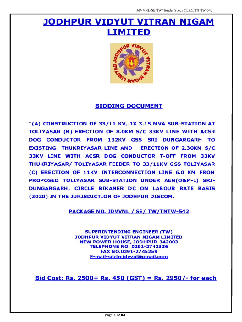 Advent/SE/TW/Tender Specs CLR/TN TW542JODHPUR VILYUI VETERAN NI GAM LIMITEDBIDDING DOCUMENT (A) CONSTRUCTION OF 33/11 KV, 1X 3.15 MVA SUBSTATION AT TOLIYASAR (B) ERECTION OF 8.0KM S/C 33KV LINE WITH