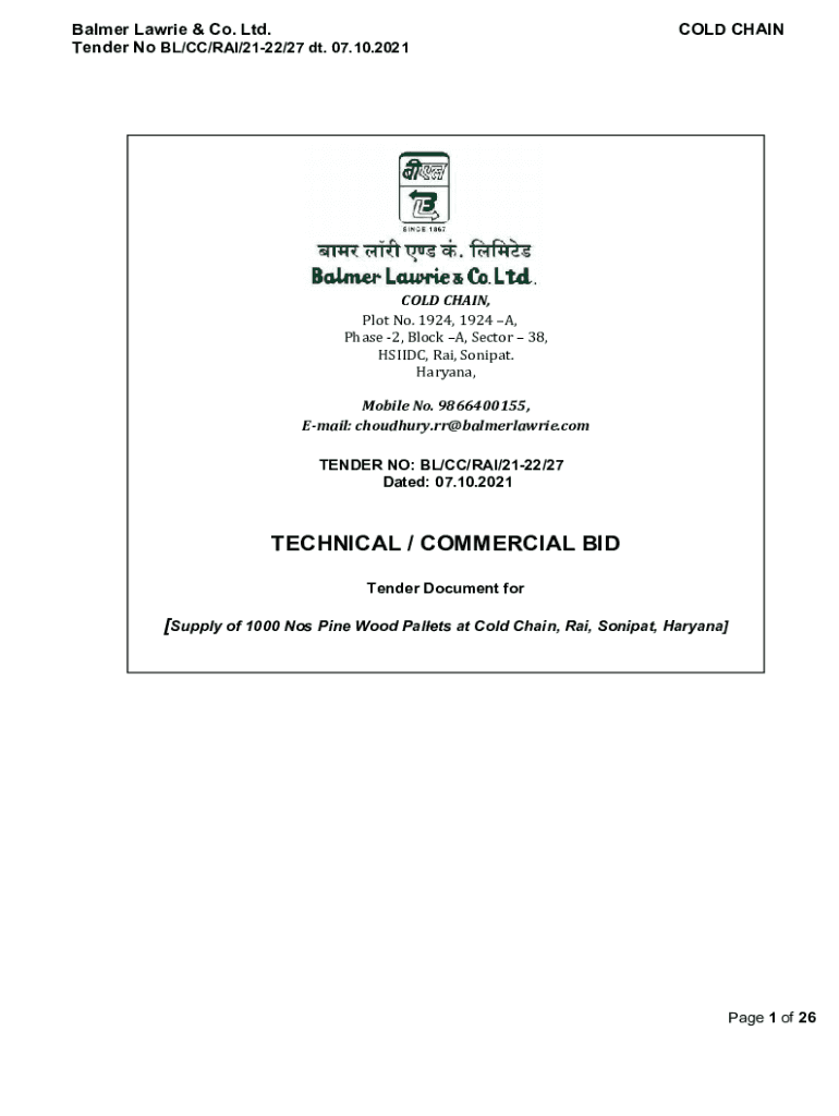 Palmer Laurie & Co. Ltd. Tender No BL/CC/RAI/2122/27 DT. 07.10.2021COLD CHANCEL CHAIN, Plot No. 1924, 1924 A, Phase 2, Block A, Sector 38, SAID, RAI, Sonia. Haryana, Mobile No. 9866400155, Email: