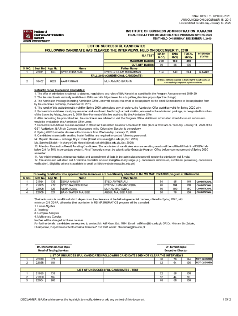 FINAL RESULT SPRING 2020, ANNOUNCED ON DECEMBER 16, 2019, Last updated on Monday, January 13, 2020INSTITUTE OF BUSINESS ADMINISTRATION, KARACHI FINAL RESULT FOR MS MATHEMATICS PROGRAM SPRING 2020