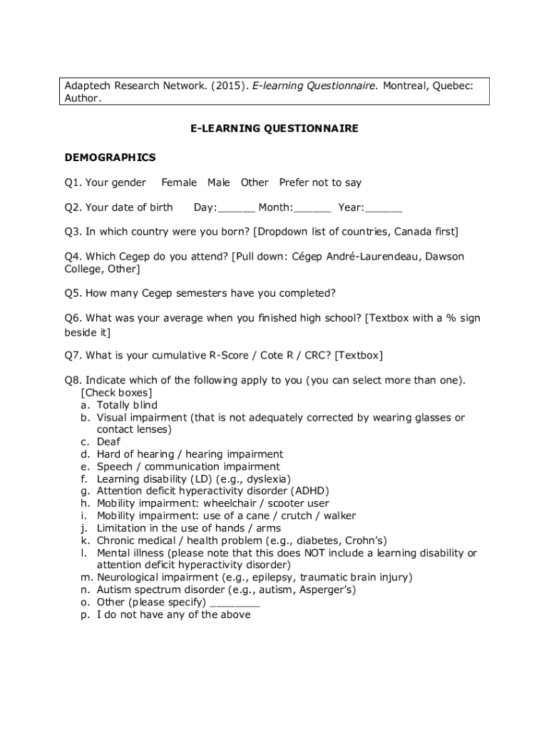Adapted Research Network. (2015). E-learning Questionnaire. Montreal, Quebec: Author. E-learning QUESTIONNAIRE DEMOGRAPHICS Q1. Your genderFemaleQ2. Your date of birthMaleOtherPrefer not to payday:___