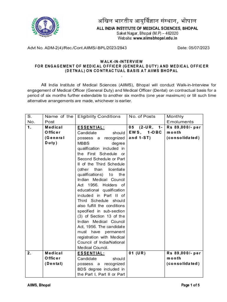 , ALL INDIA INSTITUTE OF MEDICAL SCIENCES, BHOPAL Sake Nagar, Bhopal (M. P) 462020 Website: www.aiimsbhopal.edu.in ___ Advt No. ADM2(4)/Rec./Cont.AIIMS/BPL/2023/2843Date: 05/07/2023W A L K IN T E