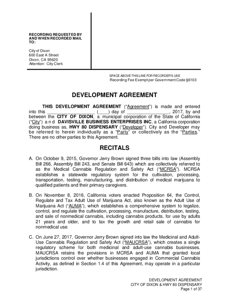 RECORDING REQUESTED BY AND WHEN RECORDED MAIL TO: City of Dixon 600 East A Street Dixon, CA 95620 Attention: City Clerk SPACE ABOVE THIS LINE FOR RECORDER\'S Rerecording Fee Exempt per Government