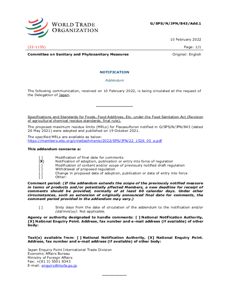 G/SPS/N/JPN/843/Add.110 February 2022 (221155)Page: 1/1Committee on Sanitary and Phytosanitary MeasuresOriginal: EnglishNOTIFICATION Addendum The following communication, received on 10 February 2022,