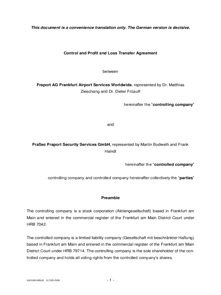 This document is a convenience translation only. The German version is decisive. Control and Profit and Loss Transfer Agreement between Report AG Frankfurt Airport Services Worldwide, represented