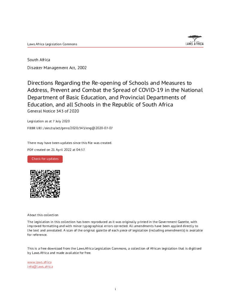 Laws. Africa Legislation Commons South Africa Disaster Management Act, 2002Directions Regarding the Reopening of Schools and Measures to Address, Prevent and Combat the Spread of COVID-19 in the National