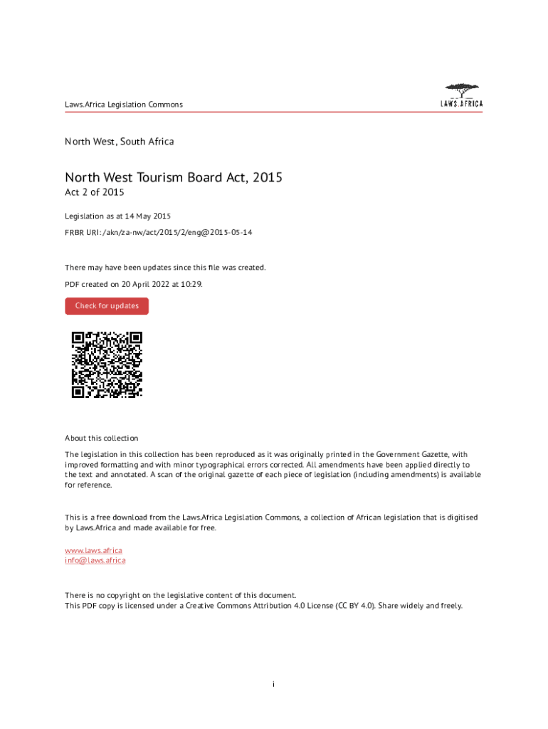 Laws. Africa Legislation Commons North West, South Africa North West Tourism Board Act, 2015 Act 2 of 2015 Legislation as at 14 May 2015 FRBR URI: /AKN/Zane/act/2015/2/eng@20150514There may have been