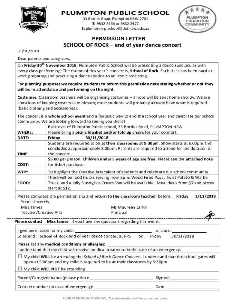 HAMPTON PUBLIC SCHOOL 33 Bottles Road, Plump ton NSW 2761 T: 9832 2466 or 9832 2477 E: plumptonp.school@det.nsw.edu.auPERMISSION INTERSCHOOL OF ROCK end of year dance concert 19/10/2018Dear parents