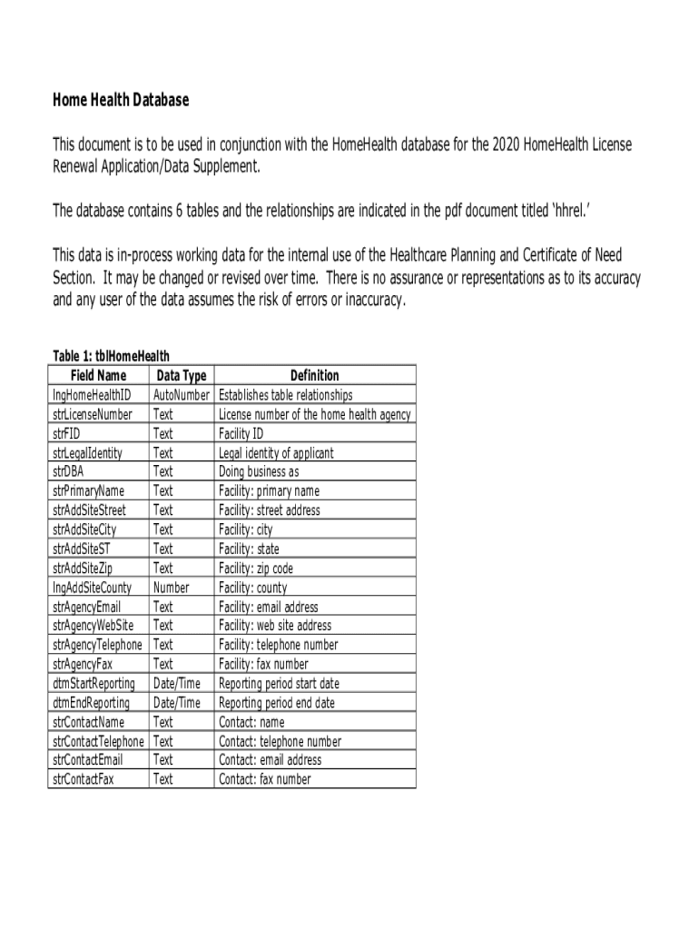 Home Health Database This document is to be used in conjunction with the Homeopath database for the 2020 Homeopath License Renewal Application/Data Supplement. The database contains 6 tables and the