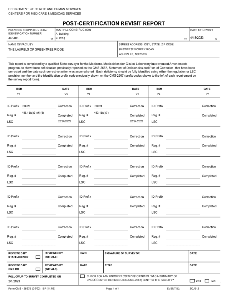 DEPARTMENT OF HEALTH AND HUMAN SERVICES CENTERS FOR MEDICARE & MEDICAID SERVICESPOSTCERTIFICATION REVISIT REPORT PROVIDER / SUPPLIER / CIA / IDENTIFICATION NUMBER345303Y1MULTIPLE CONSTRUCTION A. Building