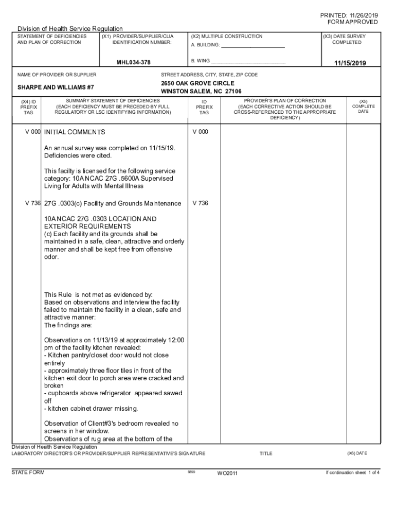 PRINTED: 11/26/2019 FORM APPROVEDDivision of Health Service Regulation STATEMENT OF DEFICIENCIES AND PLAN OF CORRECTION(X1) PROVIDER/SUPPLIER/CIA IDENTIFICATION NUMBER:(X2) MULTIPLE CONSTRUCTION A.