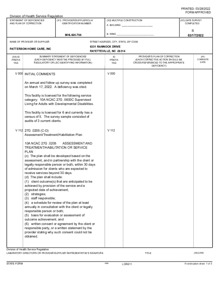 PRINTED: 03/28/2022 FORM APPROVEDDivision of Health Service Regulation STATEMENT OF DEFICIENCIES AND PLAN OF CORRECTION(X1) PROVIDER/SUPPLIER/CIA IDENTIFICATION NUMBER:PATTERSON HOME CARE, INC (X4)