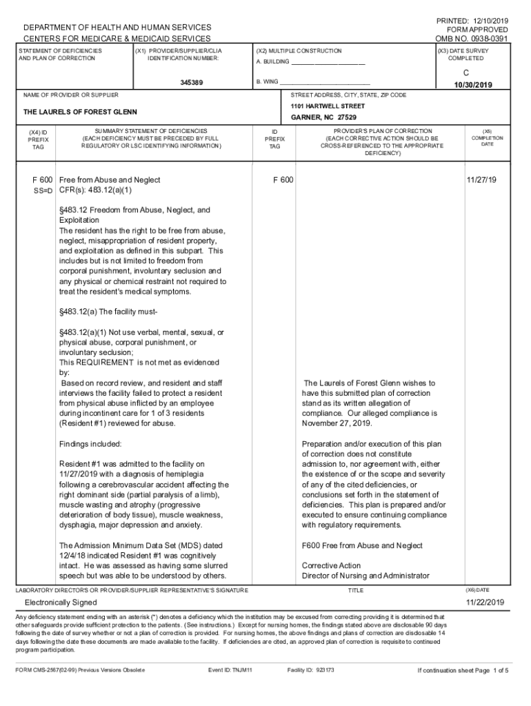 PRINTED: 12/10/2019 FORM APPROVEDDEPARTMENT OF HEALTH AND HUMAN SERVICES CENTERS FOR MEDICARE & MEDICAID SERVICES STATEMENT OF DEFICIENCIES AND PLAN OF CORRECTION(X1) PROVIDER/SUPPLIER/CIA IDENTIFICATION