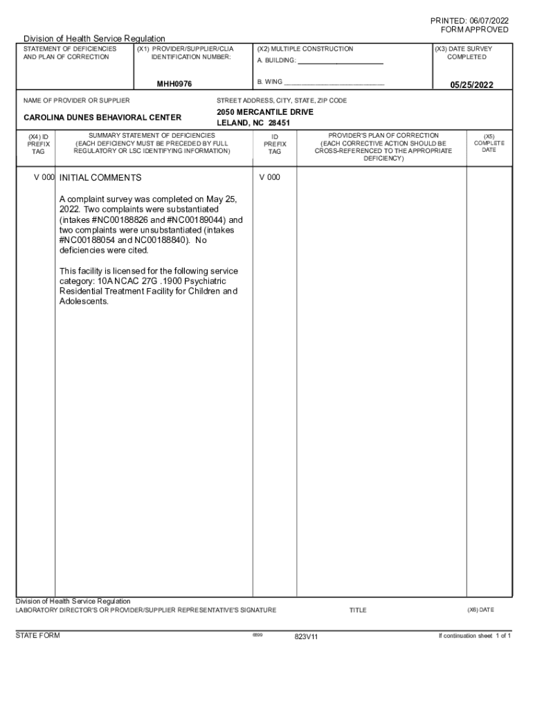 PRINTED: 06/07/2022 FORM APPROVEDDivision of Health Service Regulation STATEMENT OF DEFICIENCIES AND PLAN OF CORRECTION(X1) PROVIDER/SUPPLIER/CIA IDENTIFICATION NUMBER:(X2) MULTIPLE CONSTRUCTION A.