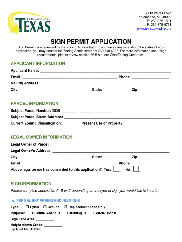7110 West Q Ave Kalamazoo, MI 49009 P: 2693751591 F: 2693750791 www.texastownship.orgSIGN PERMIT APPLICATION Sign Permits are reviewed by the Zoning Administrator. If you have questions about the