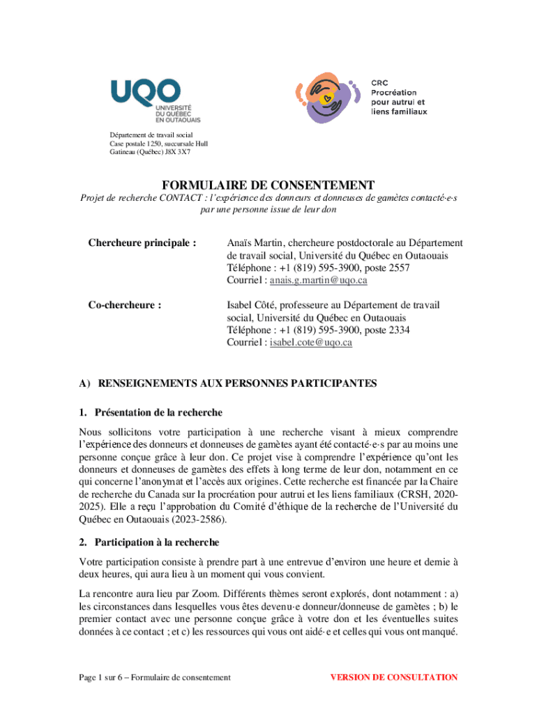 Department de travail social Case postal 1250, succursale Hull Gatineau (Quebec) J8X 3×7FORMULAIRE DE CONTENTMENT Project DE recherché CONTACT : experience DES dinners et danseuses de games contacts