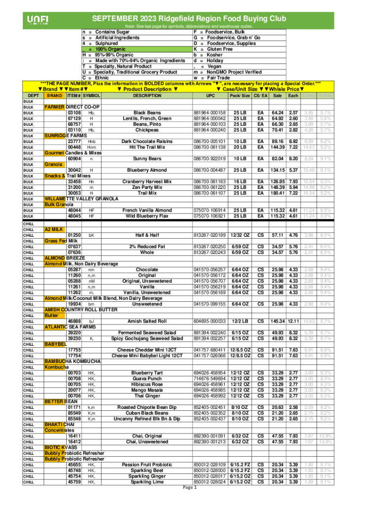 SEPTEMBER 2023 Ridgefield Region Food Buying Club Note: See last page for symbols, abbreviations and warehouse codes.n Contains Sugar F Food service, Bulk s Artificial Ingredients G Food service,