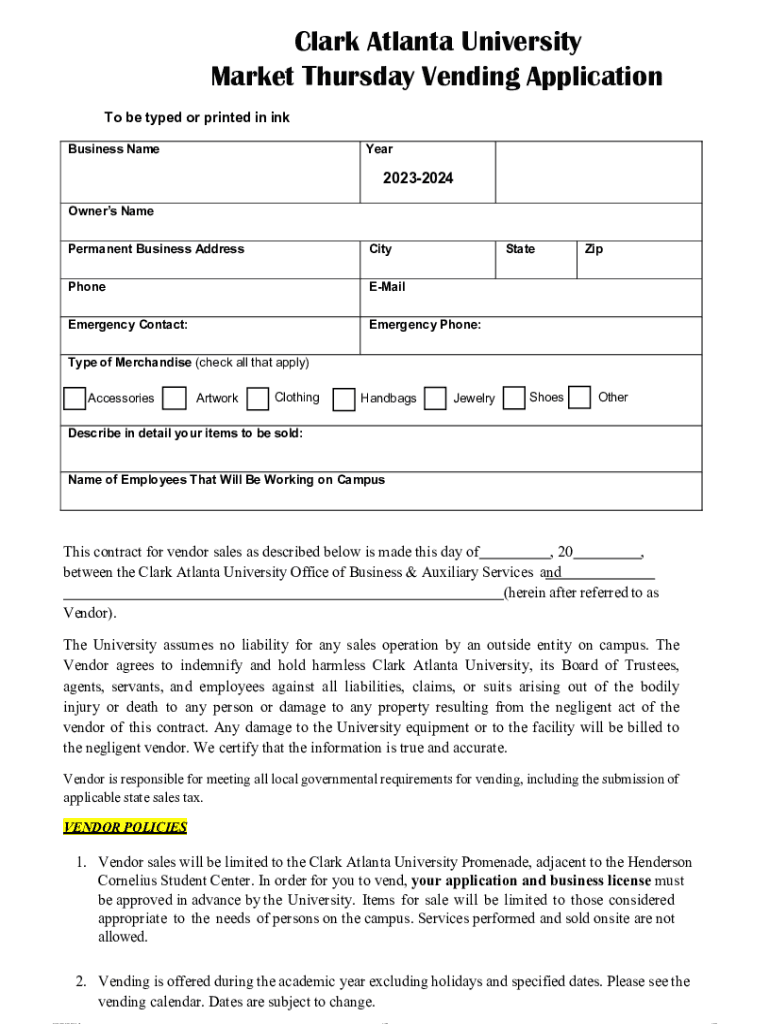 Clark Atlanta University Market Thursday Vending Application To be typed or printed in ink Business NameYear20232024 Owners Name Permanent Business AddressCityStatePhoneEMailEmergency Contact:Emergency